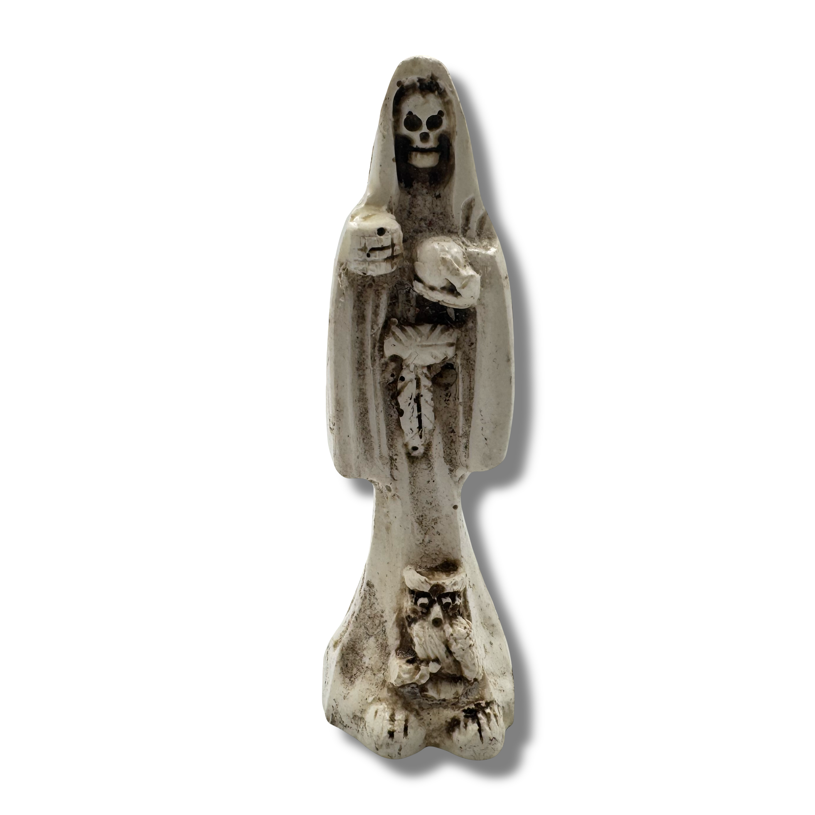 Standing 3.5 inches tall, this compact figure is ideal for a nightstand, small altar, desk, or travel shrine. Inside the base is a sealed cavity filled with traditional ritual materials, giving the piece a unique character and making each one slightly different. The figure itself features classic Santa Muerte imagery, including the scythe and symbolic details associated with her role as protector, guide, and keeper of balance.