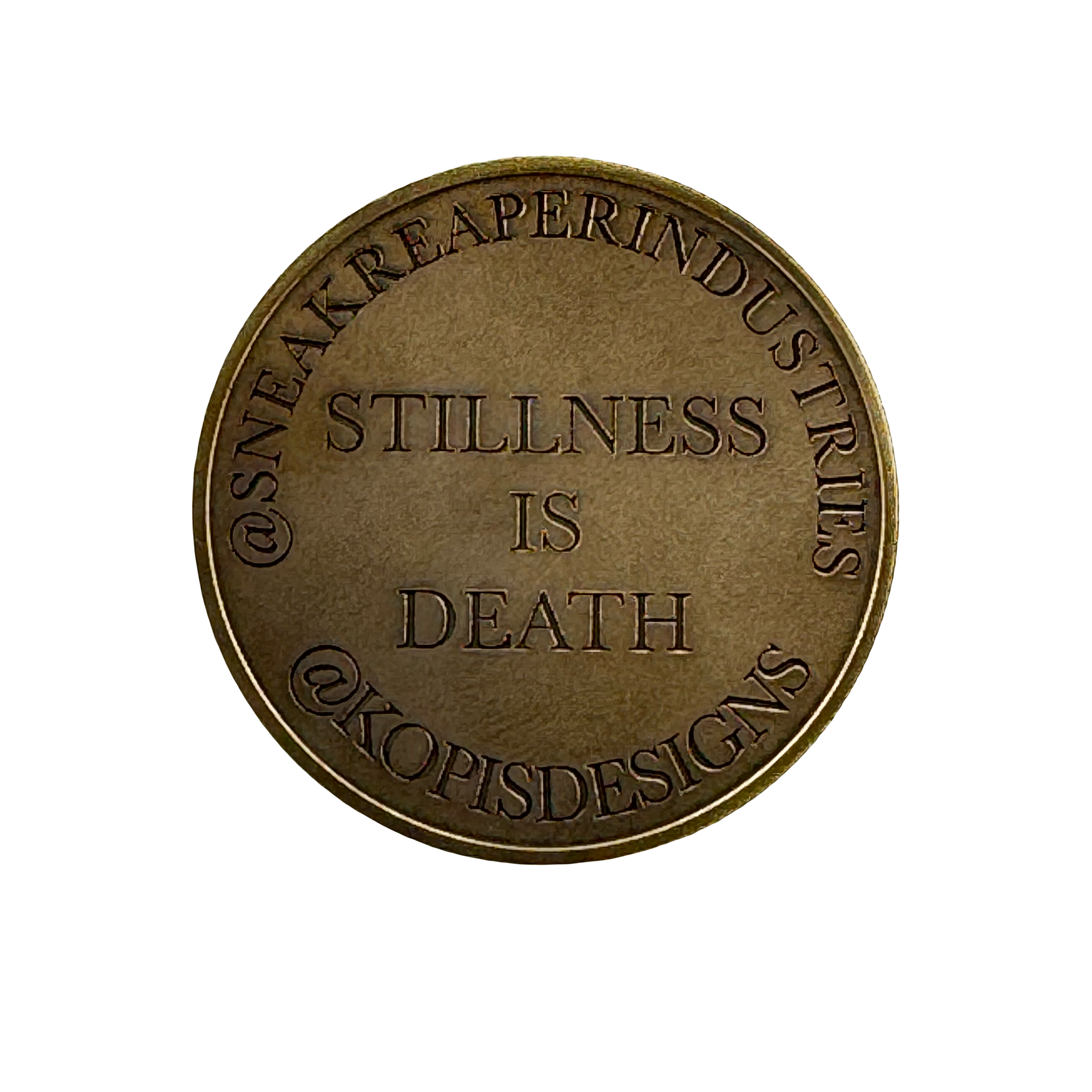 Each coin features the “Stillness Is Death” mantra, a reminder rooted in awareness, movement, and survival, paired with original Kopis Design iconography and detailing. Finished in raw brass with natural patina and wear, no two coins age exactly the same—each one tells its own story.