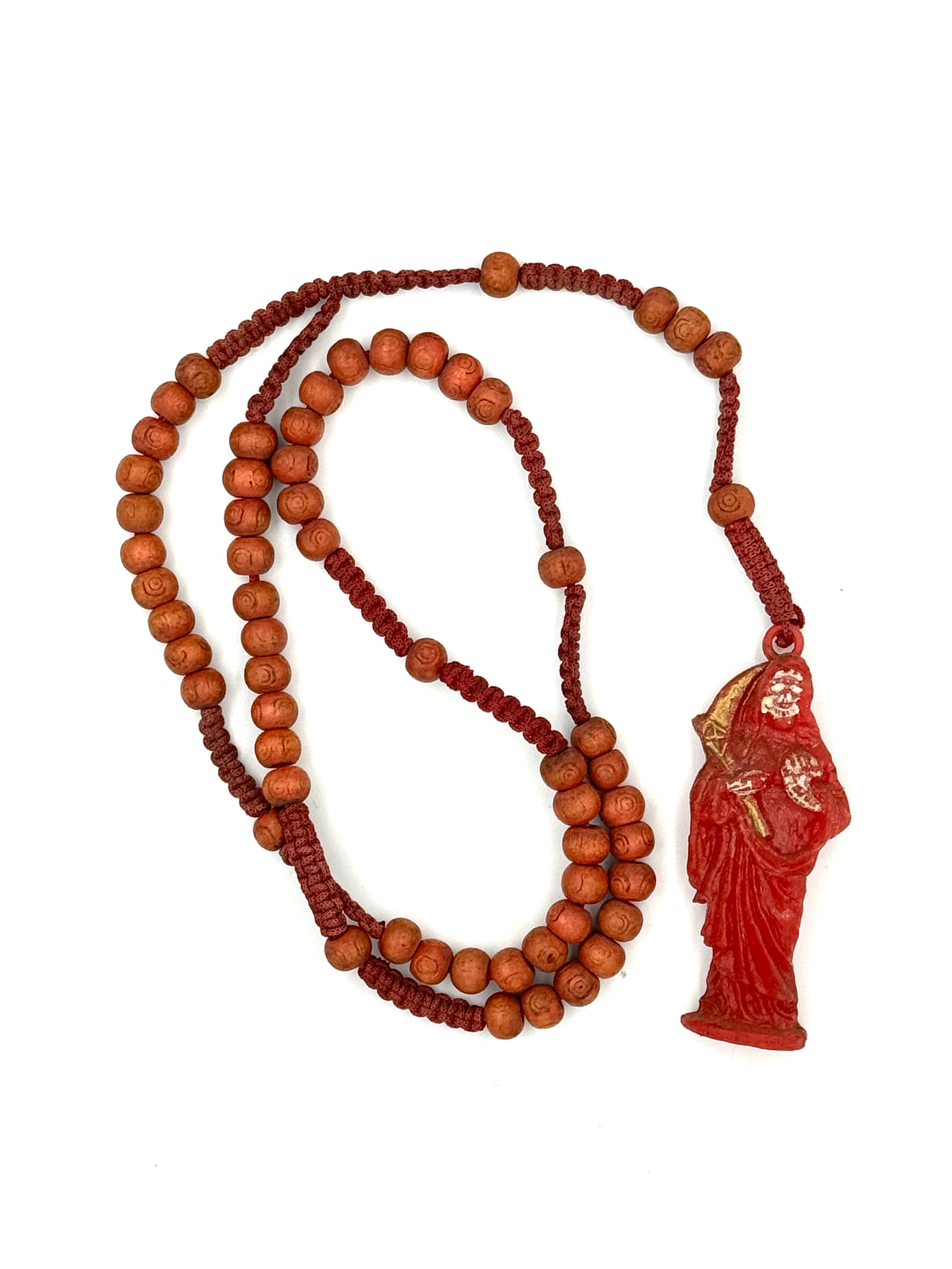 At the end of the rosary hangs a carved Santa Muerte pendant in deep red, a color traditionally associated with love, passion, strength, and blood ties, as well as protection and binding rituals. The pendant shows visible wear, softened edges, and surface aging—clear indicators that this is not a modern reproduction.